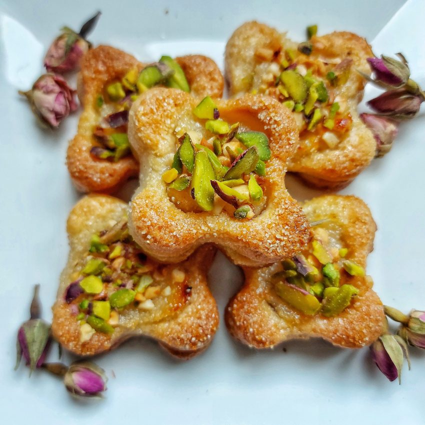 Kesilen hamurlarin yarısının ortası daha küçük bir kalipla kesilip çıkarılır. Düz olan hamur alta konur . Üzerine ortası delik hamur ırmiğe bulunarak konur. Boş kısma yarım tatlı kaşığı muhallebi konur.