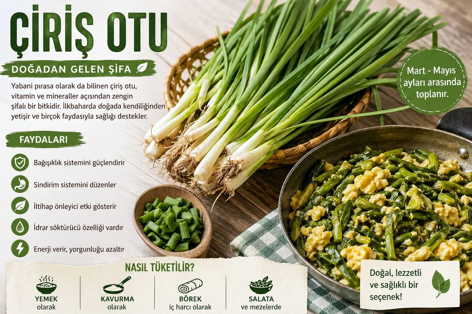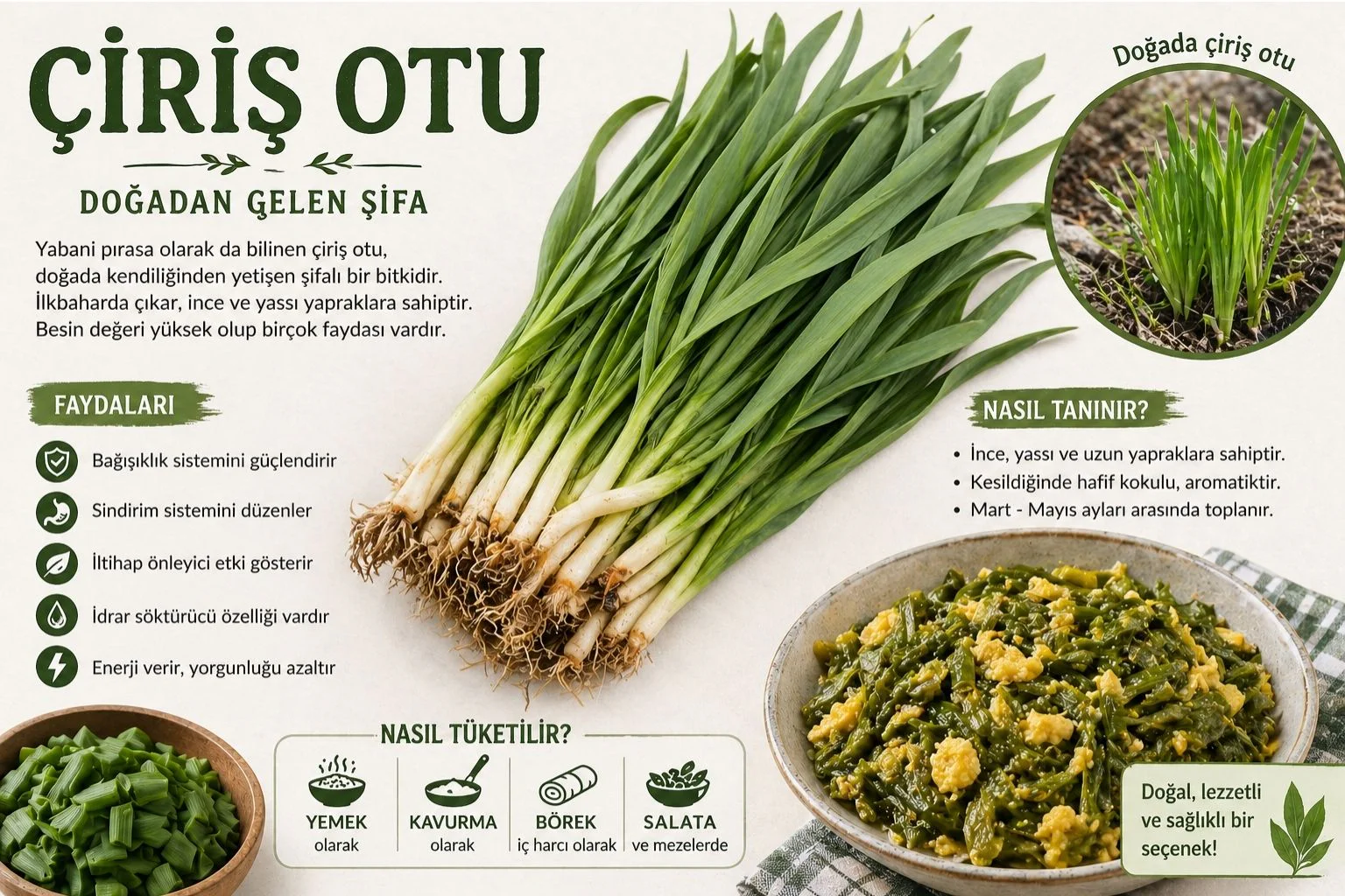 Çiriş otu, hem lezzeti hem de sağlık açısından sunduğu faydalarla sofralarda yer almayı hak eden doğal bir bitkidir. Özellikle mevsiminde taze olarak tüketildiğinde besin değerinden maksimum fayda sağlanabilir.